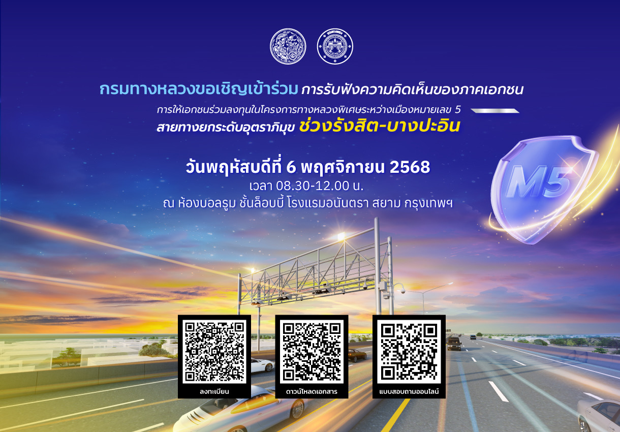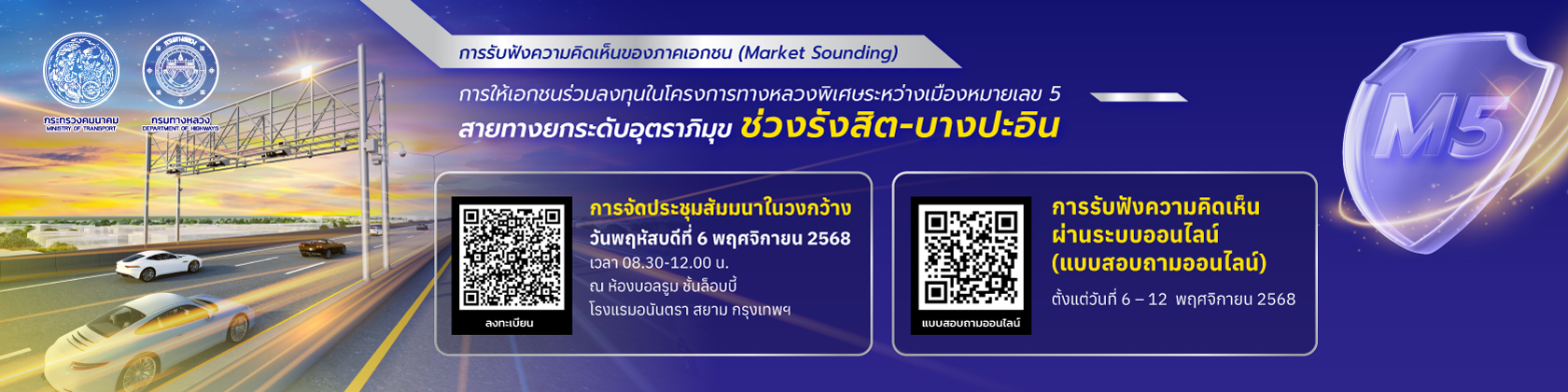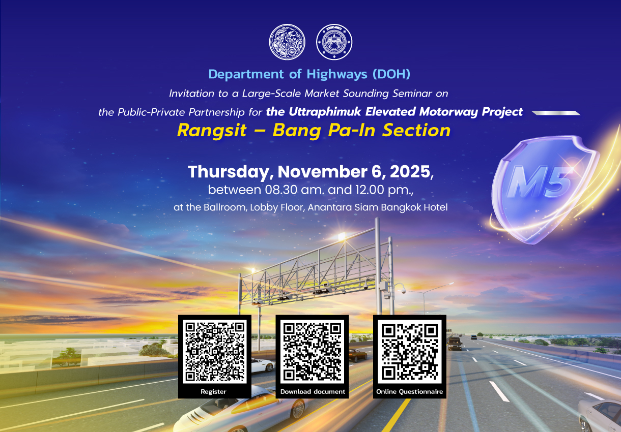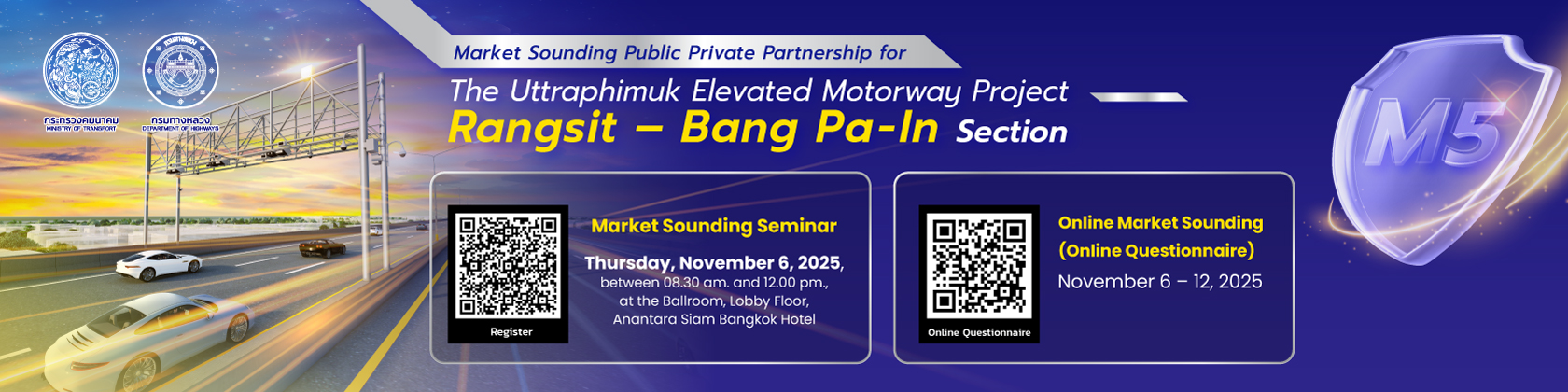 The Department of Highways is holding a Market Sounding for Uttraphimuk Elevated Motorway Project, Rangsit – Bang Pa-In Section, Public-Private Partnership, in accordance with the Announcement of the PPP Policy Commission Regarding Criteria and Methods for Public Hearings from the Private Sector, B.E. 2563 (2020), through 2 following channels: