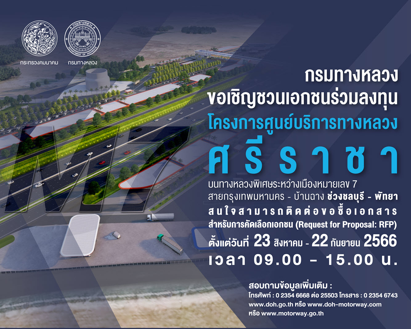 กรมทางหลวงขอเชิญชวนการให้เอกชนร่วมลงทุนในการพัฒนาและบริหารจัดการโครงการศูนย์บริการทางหลวงศรีราชา บนทางหลวงพิเศษระหว่างเมืองหมายเลข 7 สายกรุงเทพมหานคร – บ้านฉาง ช่วงชลบุรี – พัทยา